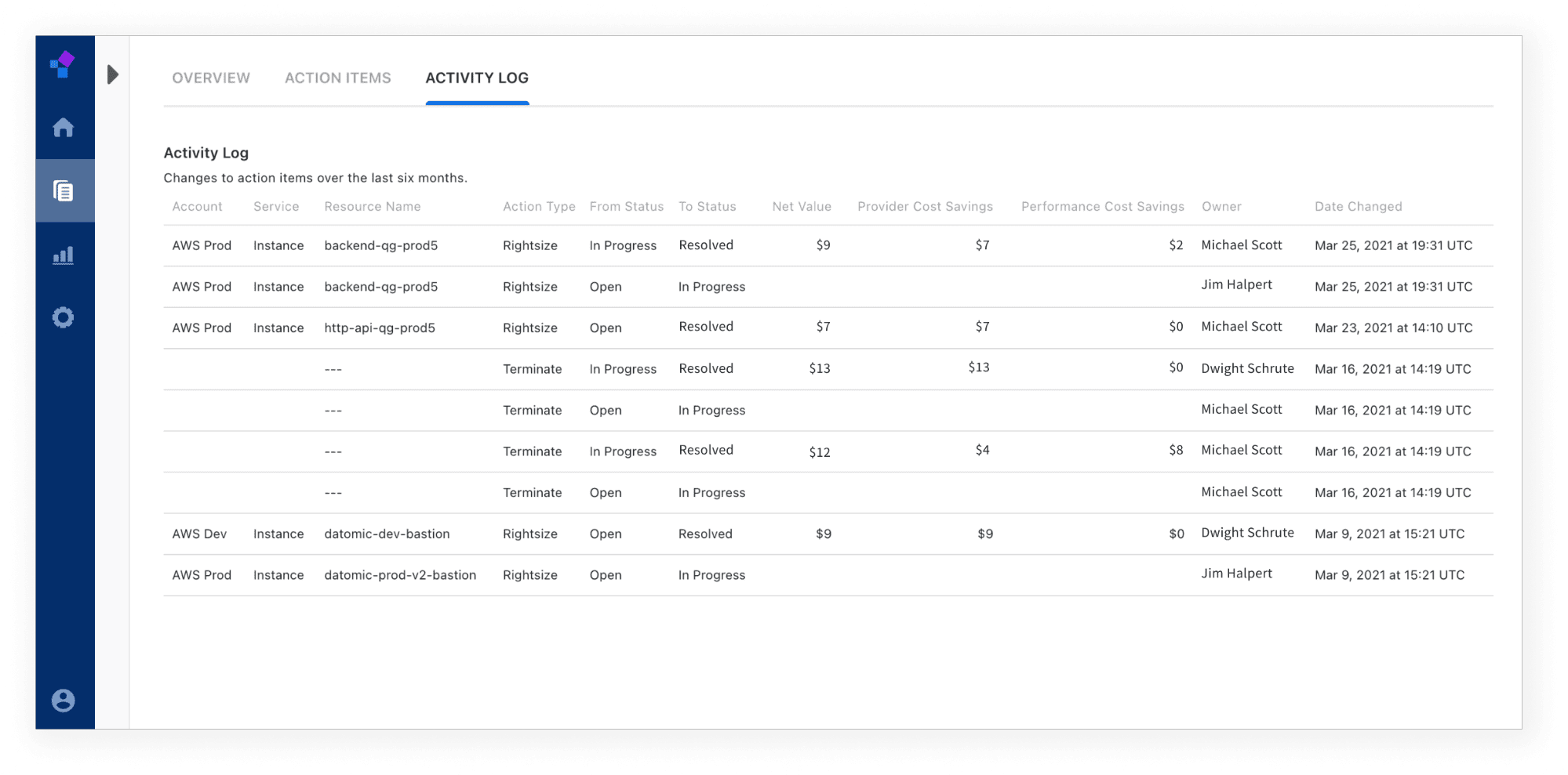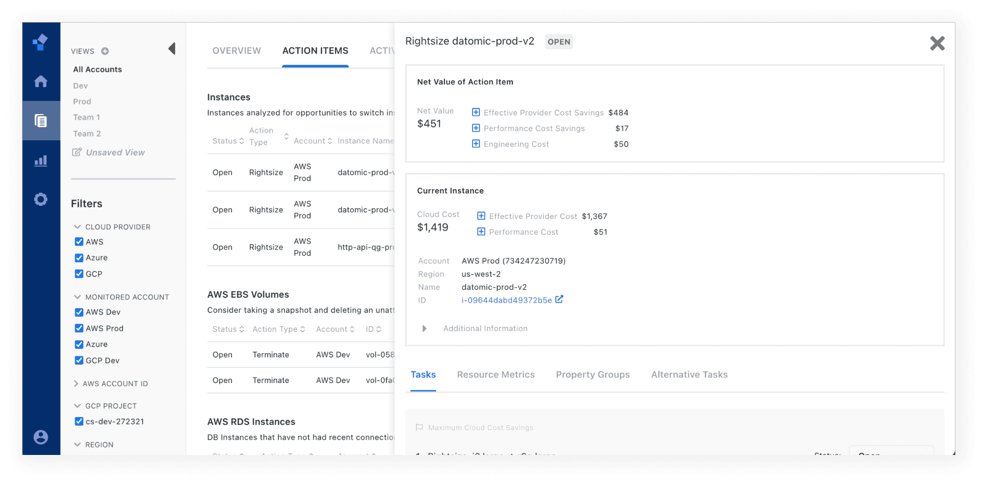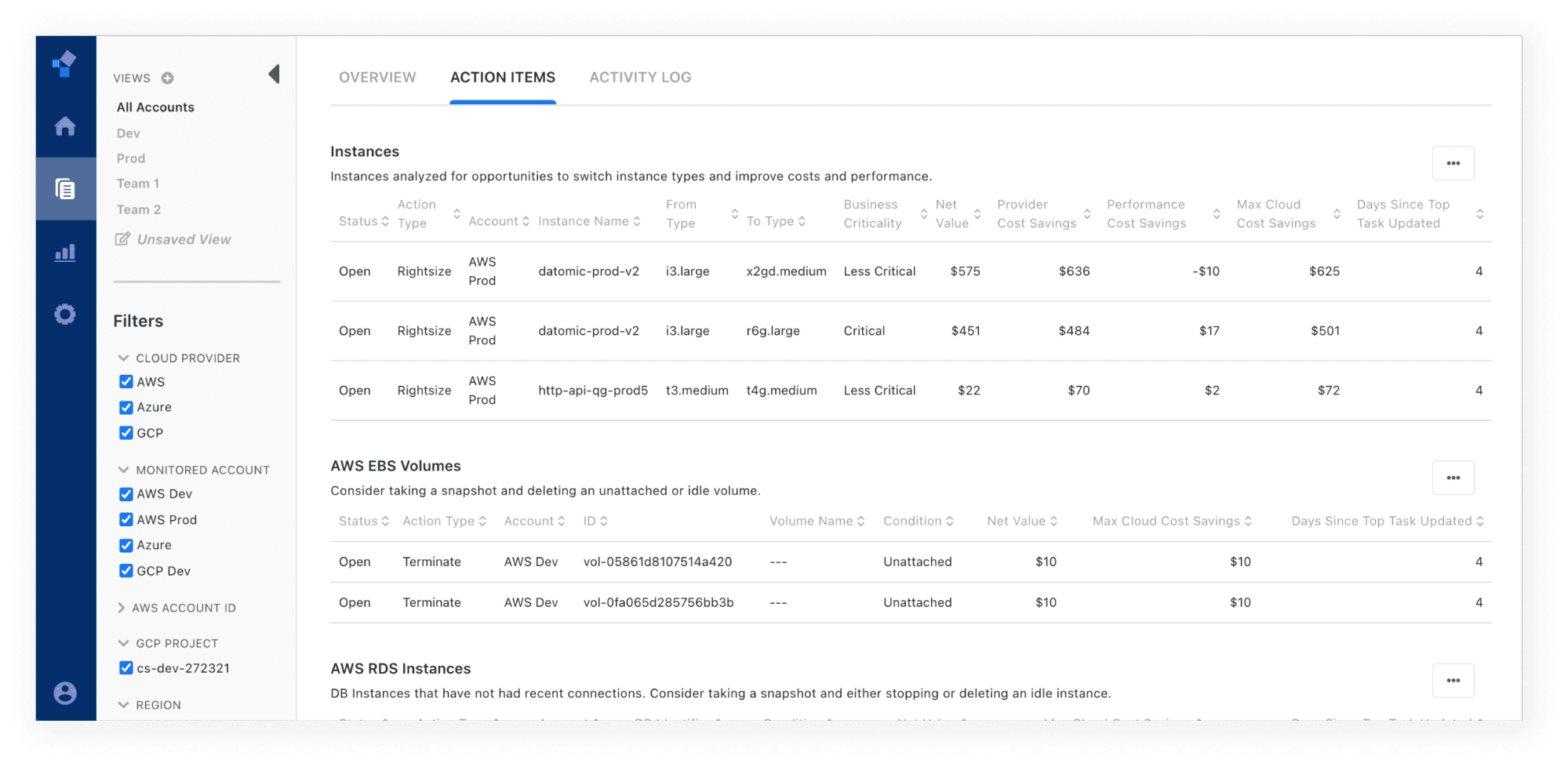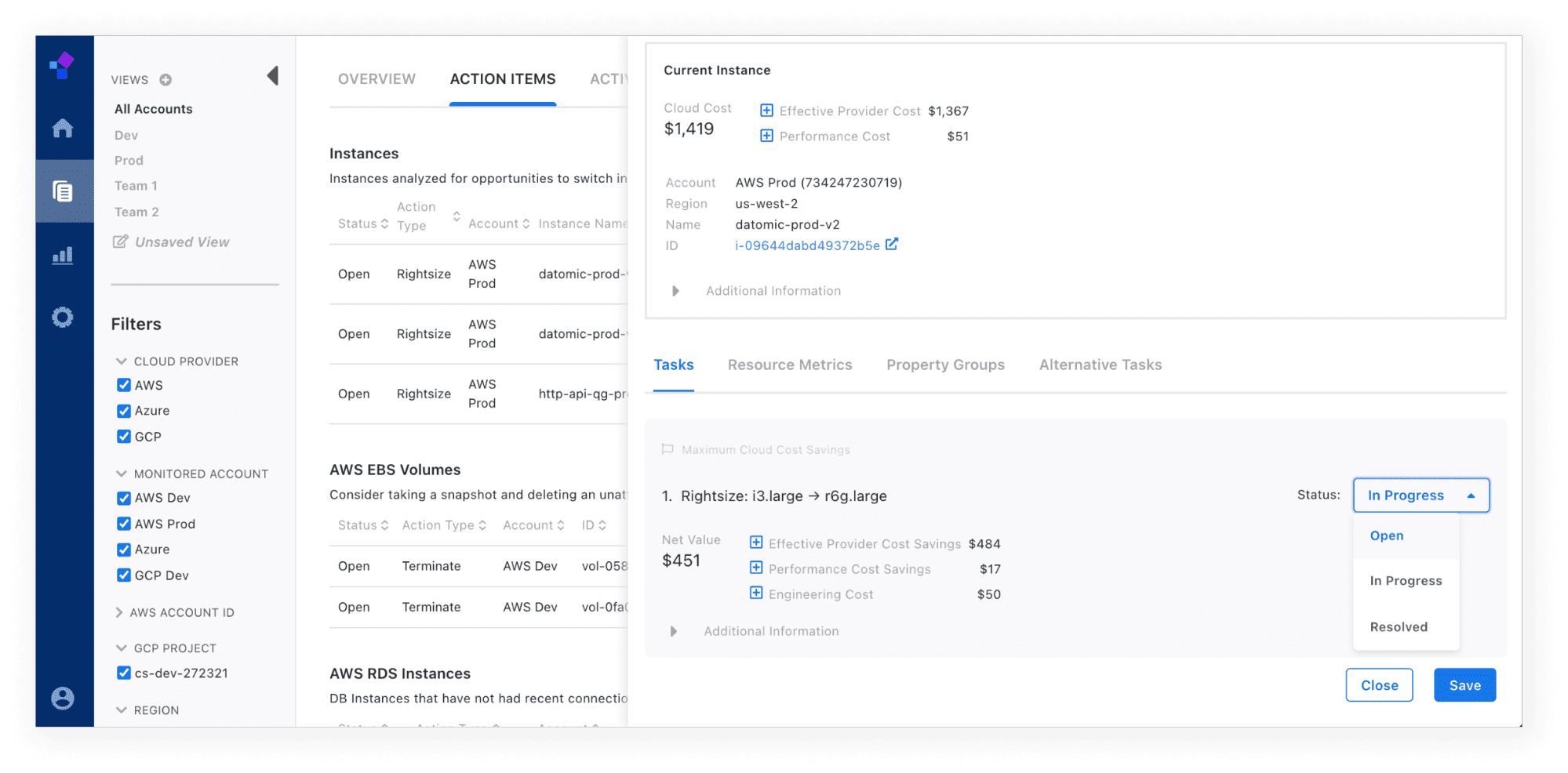 Note: If you choose to terminate or rightsize a resource, you should resolve the action item before executing the change with your cloud provider. Once a resource is terminated, we are no longer able to detect the resource. Resolving the action item in advance will ensure proper tracking of your activity.