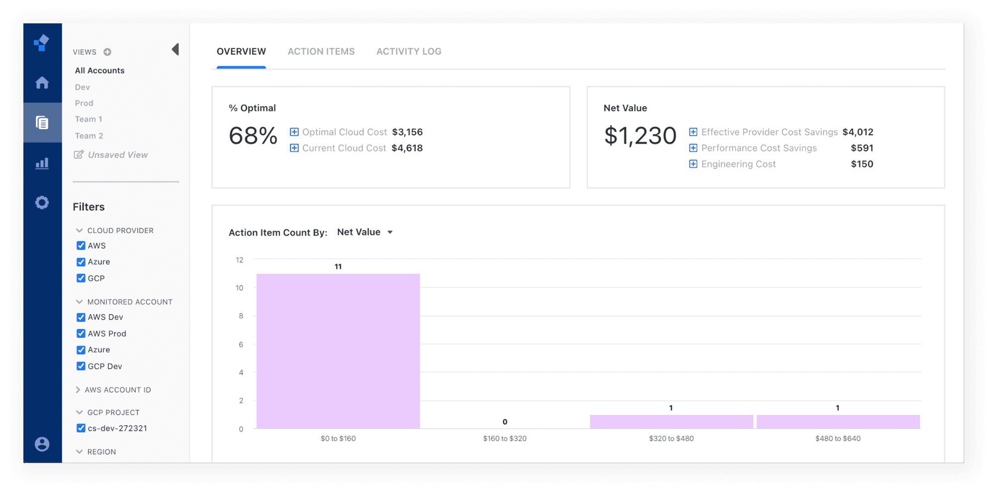 In the Action Items section, you have the ability to view key metrics and the highest value cloud action items, and manage the execution of those items. The Activity Log helps you track status changes to action items, as well as the business value of resolving those items.