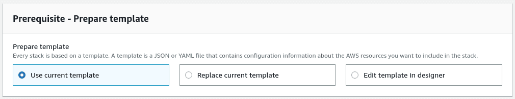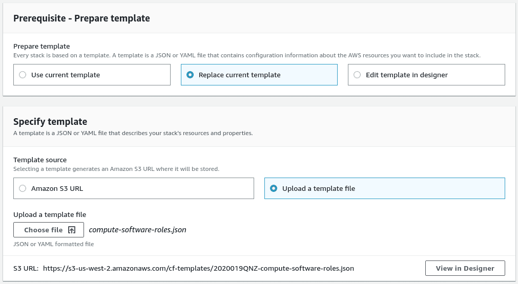 2. If no new CloudFormation template file was provided to you by Compute Software, select "Use current template" and click Next. If a new CloudFormation template JSON file was provided to you by Compute Software, select "Replace current template". Then select "Upload a template file". Click "Choose file" and select the CloudFormation template JSON file provided to you by Compute Software. Click Next.