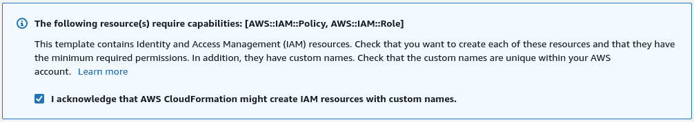 2. Ensure "I acknowledge that AWS CloudFormation might create IAM resources with custom names." is checked. Click "Create stack".