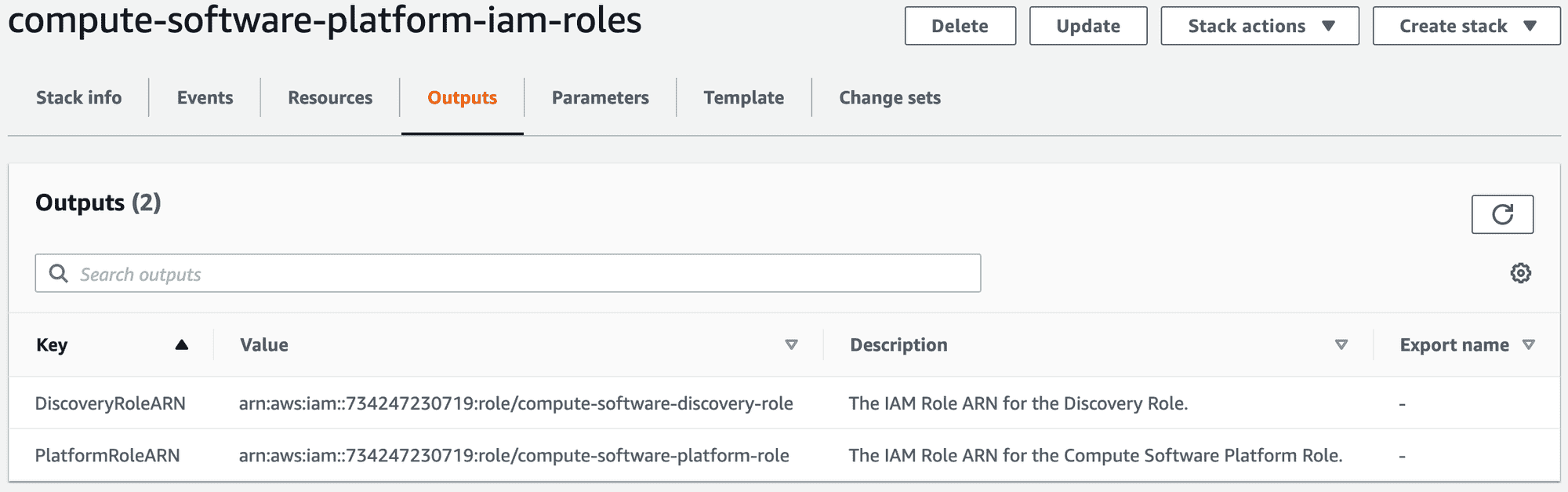 3. After the stack says CREATE_COMPLETE, navigate to the Outputs tab and locate the rows for DiscoveryRoleARN and PlatformRoleARN. If DiscoveryRoleARN is not included in the output, it can be skipped.