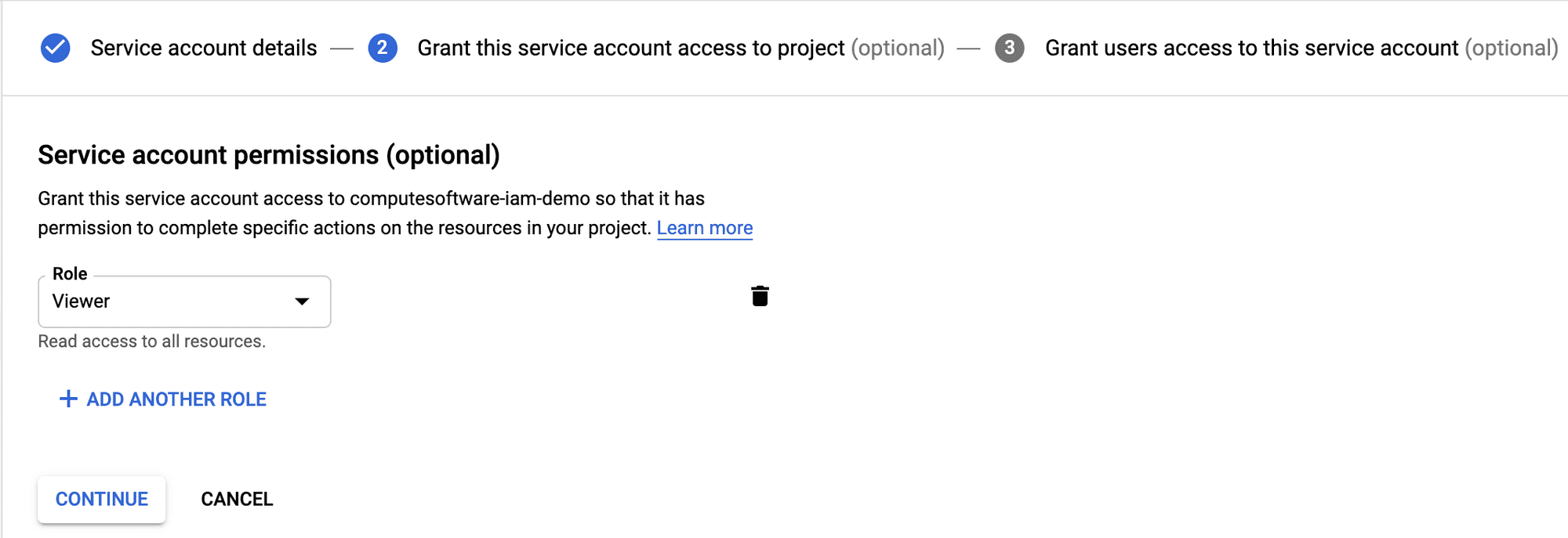 The service account is used to provide the Compute Software Platform access to your GCP. The below steps will walk you through creating a service account and assigning the Project Viewer role.