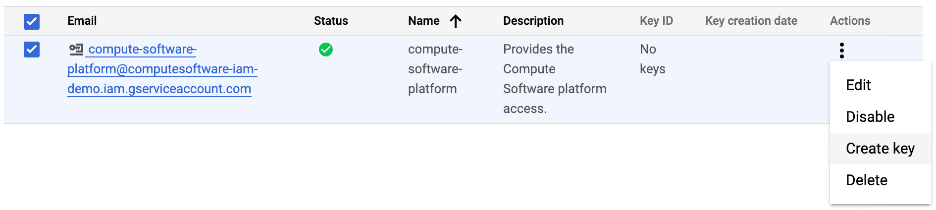 4. This service account has now been created and will be viewable in the Service account page. Click the action icon button and select "Create key".