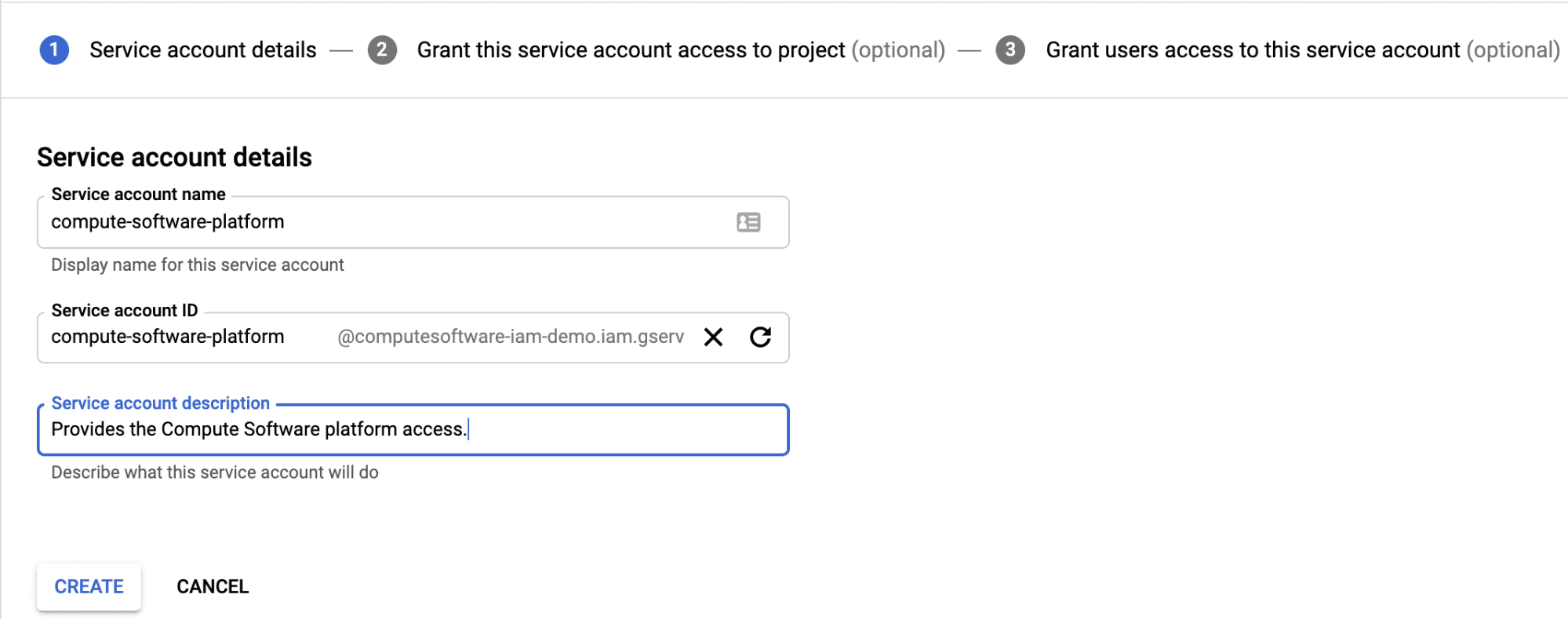 1. Navigate to the Create service account page. Ensure the correct project is selected. Input a service account name and an optional description. Click "Create".