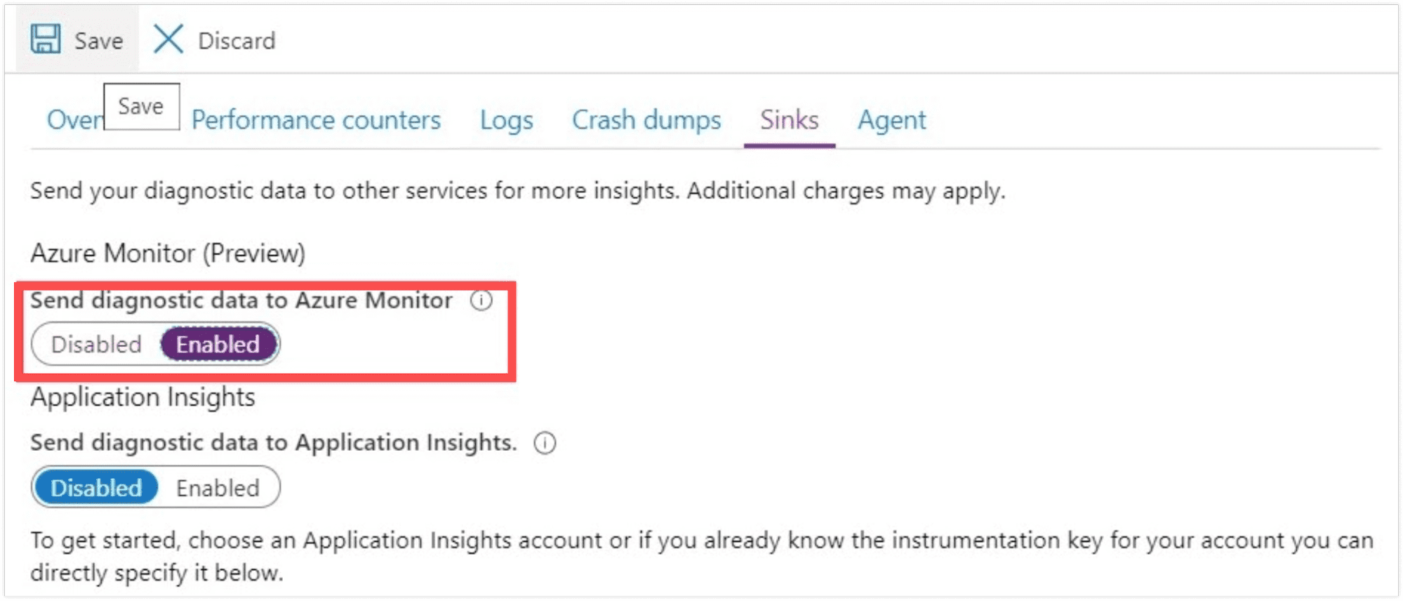 5. In the Sinks tab, under Send diagnostic data to Azure Monitor, select Enabled. Click Save.