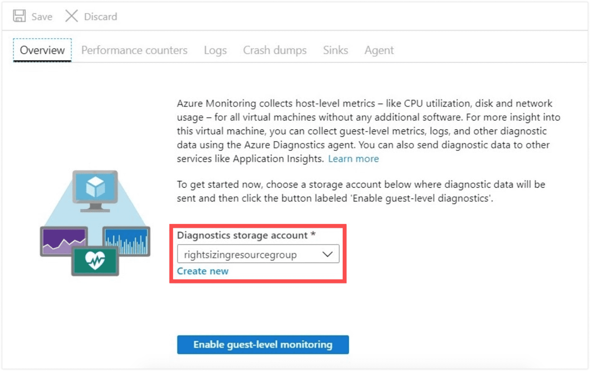 5. In the Overview tab, under the Diagnostics storage account drop-down, select or create a diagnostics storage account.