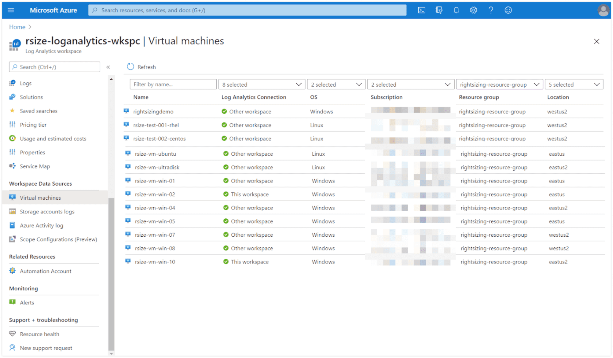 4. View the grid to verify each resource is associated with a Log Analytics Workspace.