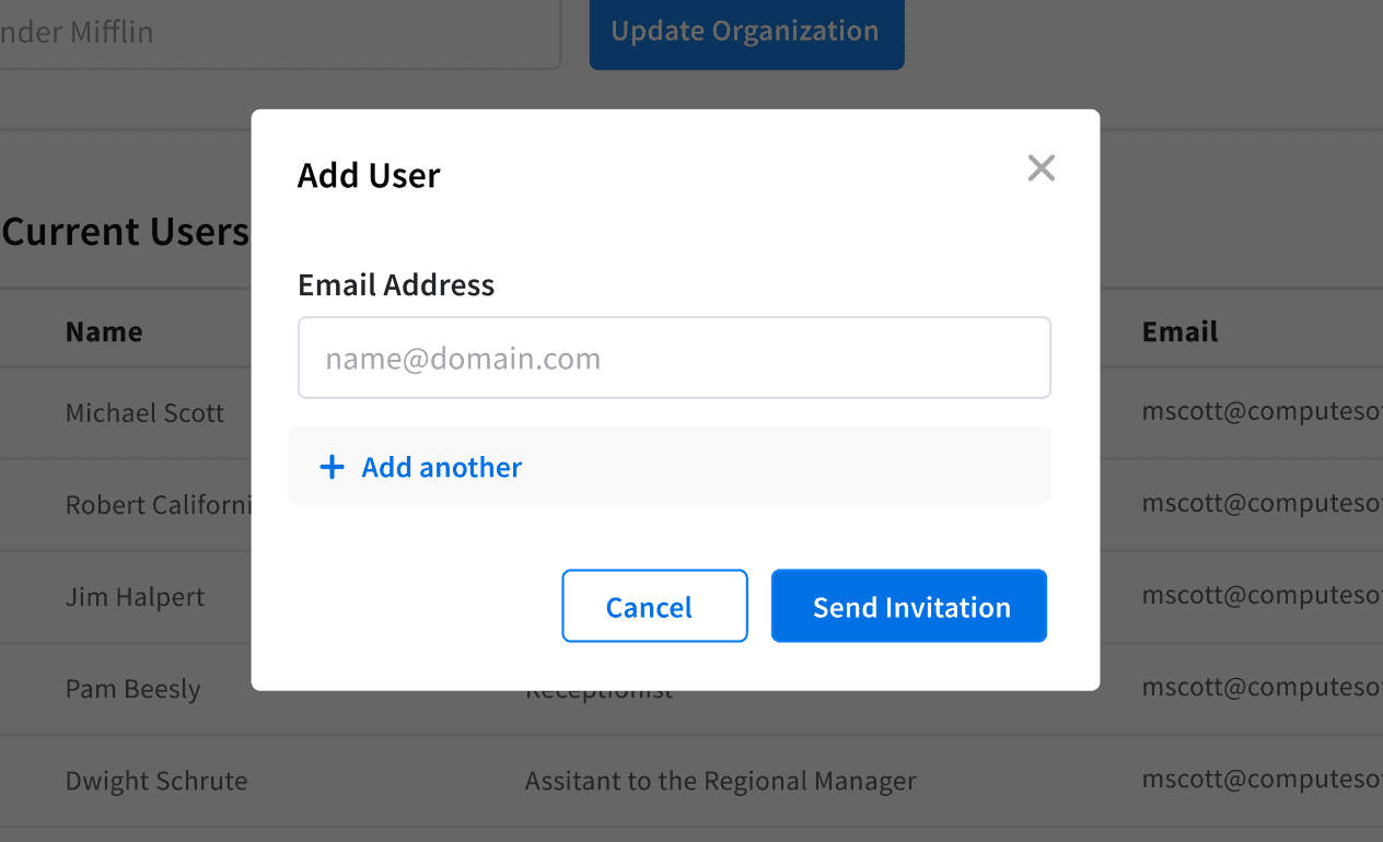 3. You will then be prompted to enter an email address for the new user(s). Press “Send Invitation” to send an email to the new users to set up an account.