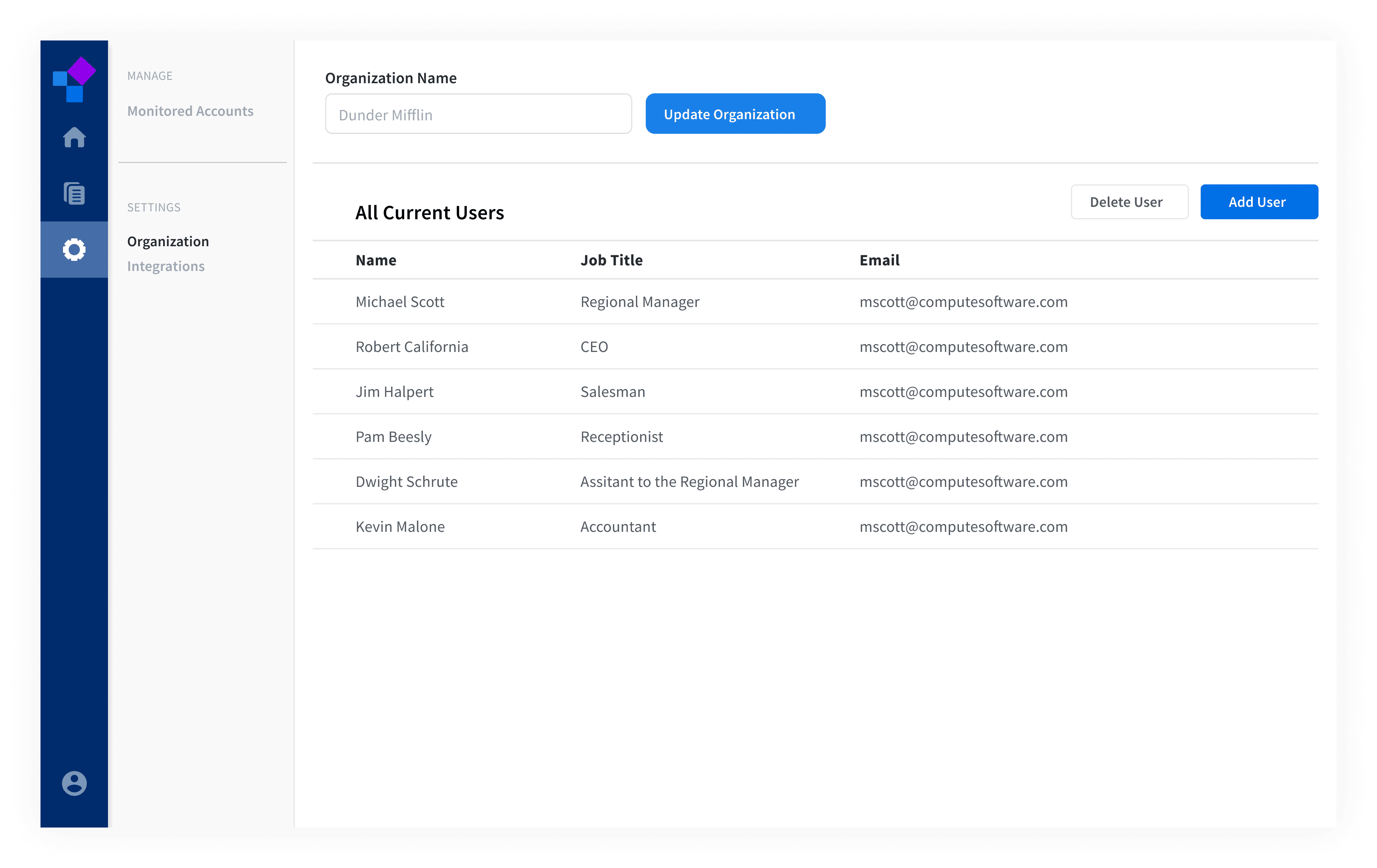 1. Navigate to the Admin section and make your way to “Organization” under Settings. There you will see a list of All Current Users.