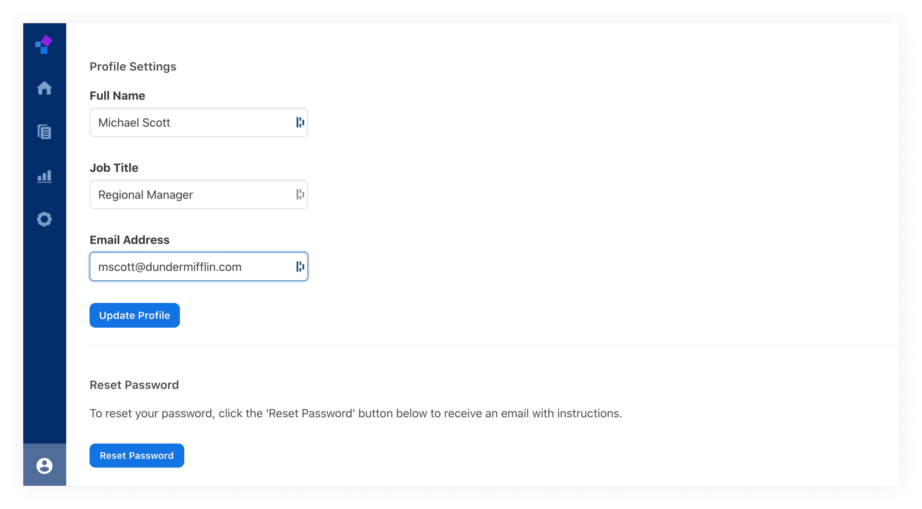 A user's profile settings and information are located in the Profile section below. A user may update their name, job title, email address and password.