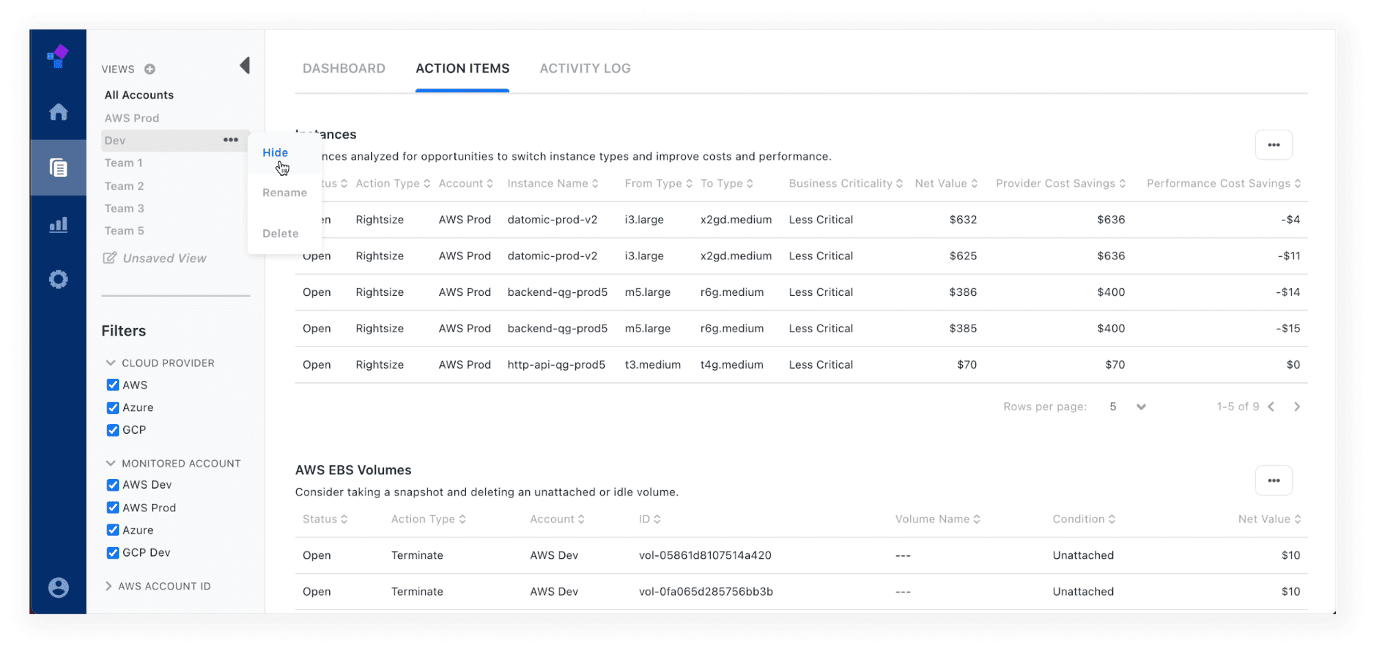 To quickly hide, rename or delete a view in your views menu, you can hover over a view and click on the three dots to view the options.
