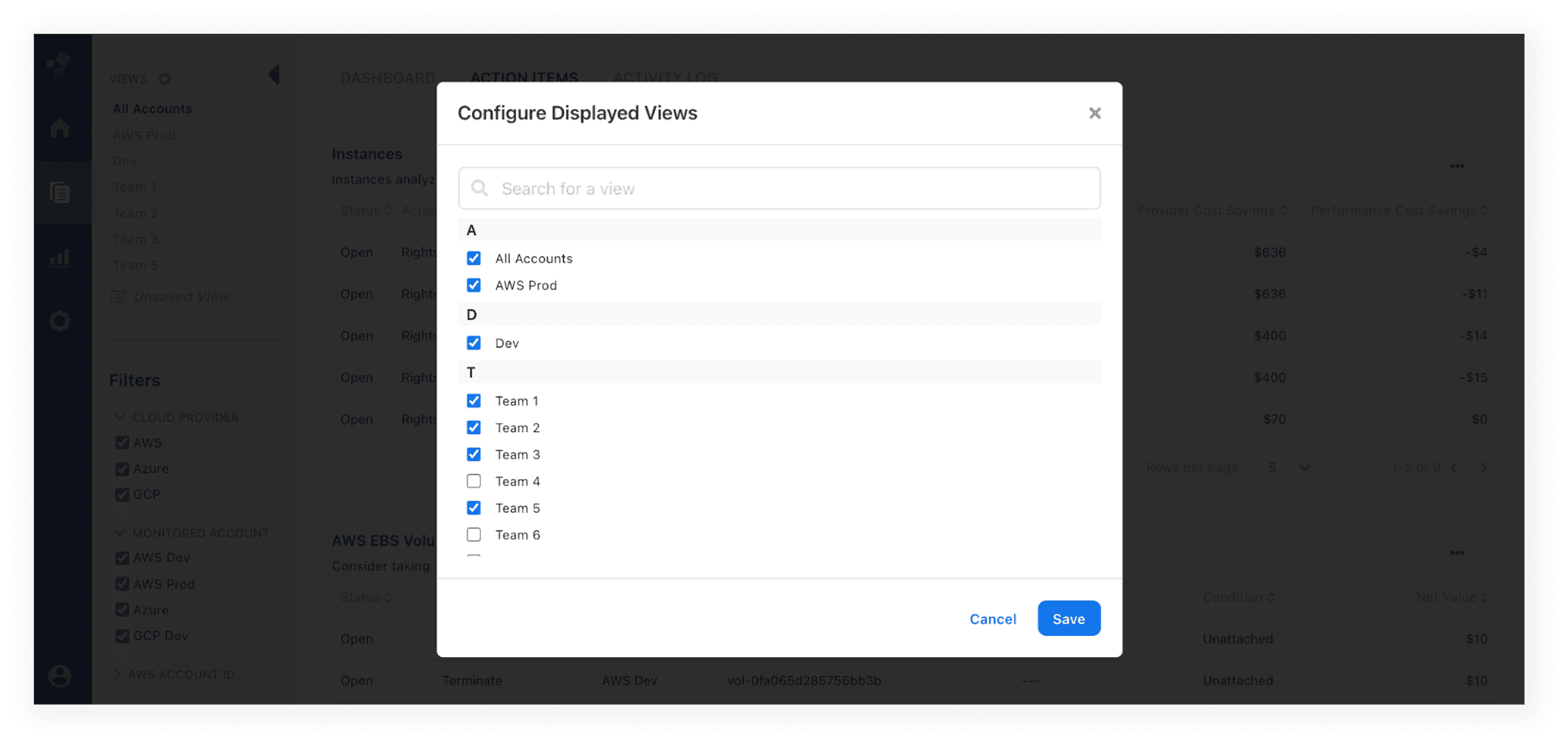 The default view “All Accounts” appears when you log in to the platform, however you may now configure what views you would like to see in the menu for quick-selecting. To select more views to display in the menu, click the plus button next to the views title to open a configuration menu.